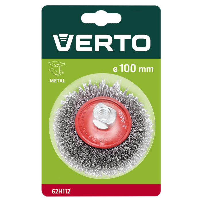 Дротяна щітка VERTO (арт. 62H112) діаметром 100 мм, виготовлена зі сталевого дроту товщиною 0,33 мм. Посилена конструкція кузова дозволяє ефективно очищати металоконструкції. Кріплення адаптоване для використання з кутовими шліфувальними машинами. Бренд VERTO пропонує широкий асортимент електроінструментів та аксесуарів для кожного майстра.