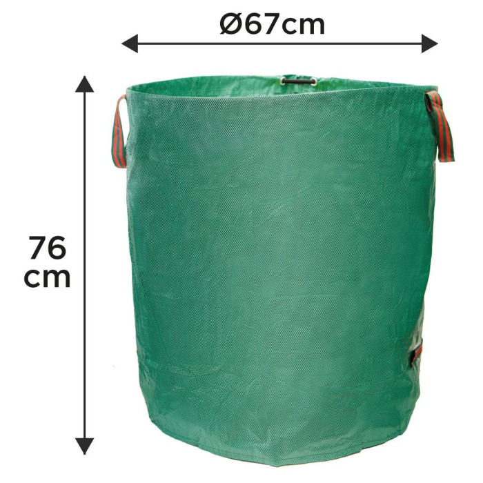 Садовая сумка 270 л, жесткий край, 150 г/м2 15G541 от VERTO вместимостью 270 литров, оснащена прочными, тремя ручками для переноски. Имеет жесткую кромку для усиления конструкции. Мешок изготовлен из прочного полипропиленового материала весом 150 г/м2. Он имеет диаметр 69 см и высоту 76 см. Рекомендуется для сухих листьев, сорняков и скошенной травы. Незаменим для каждого сада и приусадебного участка.