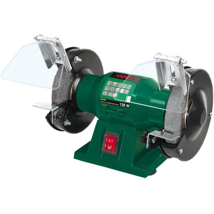 Заточной станок Verto 51G425 120 Вт з діаметром робочих дисків 125 мм. Призначена для виконання легких робіт в невеликих майстерень, а також для майстрів-аматорів. Дуже добре підходить для заточування таких інструментів, як свердла і зубила, з можливістю кріплення дискових дротяних щіток. Корпус міцний, з захисними екранами. Максимальна частота обертання робочого диска без навантаження становить 2950 об. / Хв. Шліфувальна машина продається в комплекті з 2 шліфувальними дисками A36 і A60. Відповідність європейським стандартам в галузі безпеки підтверджує сертифікат CE. Бренд VERTO пропонує асортимент електроінструменту і робочого приладдя, для кожного домашнього майстра.