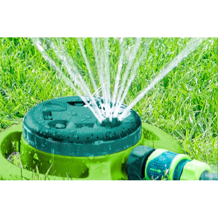 Садовий розпилювач з 8 функціями дозволяє зручно розбризкувати поверхні площею до 125 м2. Виріб виготовлено з високоякісного матеріалу, стійкого до пошкоджень. Стабільна основа забезпечує рівномірне зволоження. 8 різних режимів поливу дозволяють вибрати оптимальний тип струї для надання форми зрошуваної поверхні.