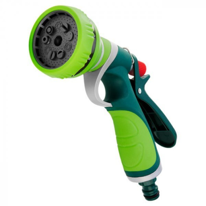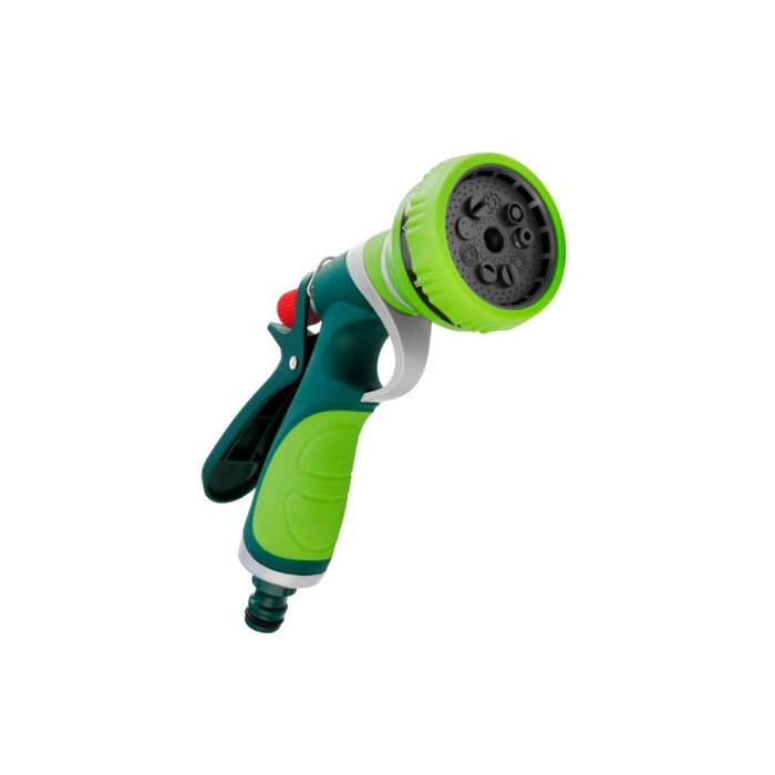 Спринклер пістолетного типу з 9 вбудованими функціями від садівничого бренду VERTO. Це практичний, багатосезонний пристрій, необхідний для поливу зелених насаджень. Спринклер оснащений можливістю персоналізації струменя води - від м'якої крапельки до сильного, концентрованого струменя. Завдяки чіткому позначенню типів функцій на голові робота в саду стане приємнішою та ефективнішою. Спринклер також має задній важіль з фіксатором, який дозволяє швидко запускати і зупиняти струмінь води. Виріб виготовлений з якісного пластику, з додатковою ручкою, покритою нековзкою гумою. Спринклер призначений для шлангів з параметрами: ½” – ¾””.