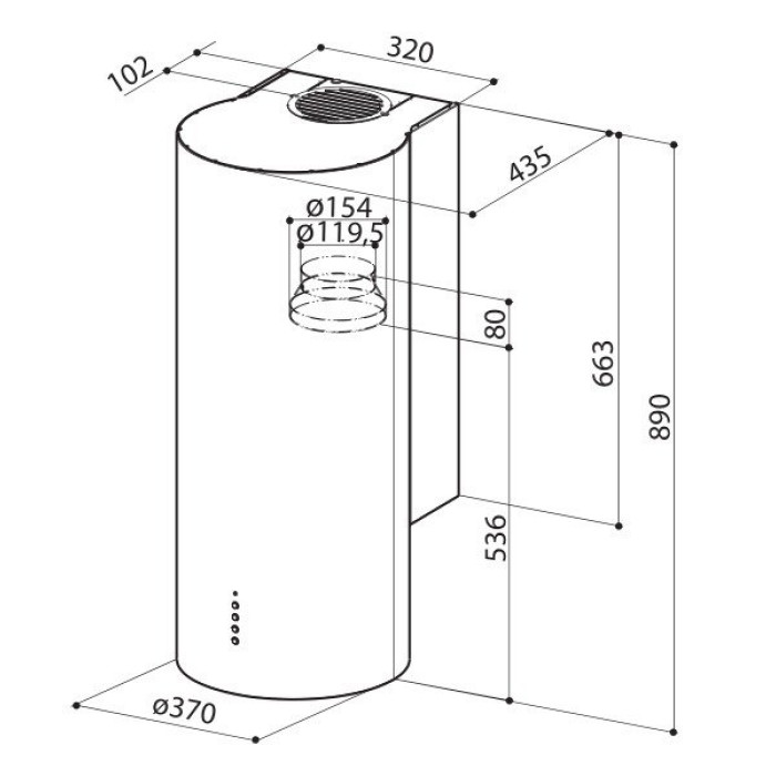 Витяжка оригінальної циліндричної форми призначена для настінного монтажу над невеликими варильними панелями (ширина приладу 37 см). Корпус моделі виготовлено з нержавіючої сталі, його висота становить 89 см. Оснащення в... Читать далее...