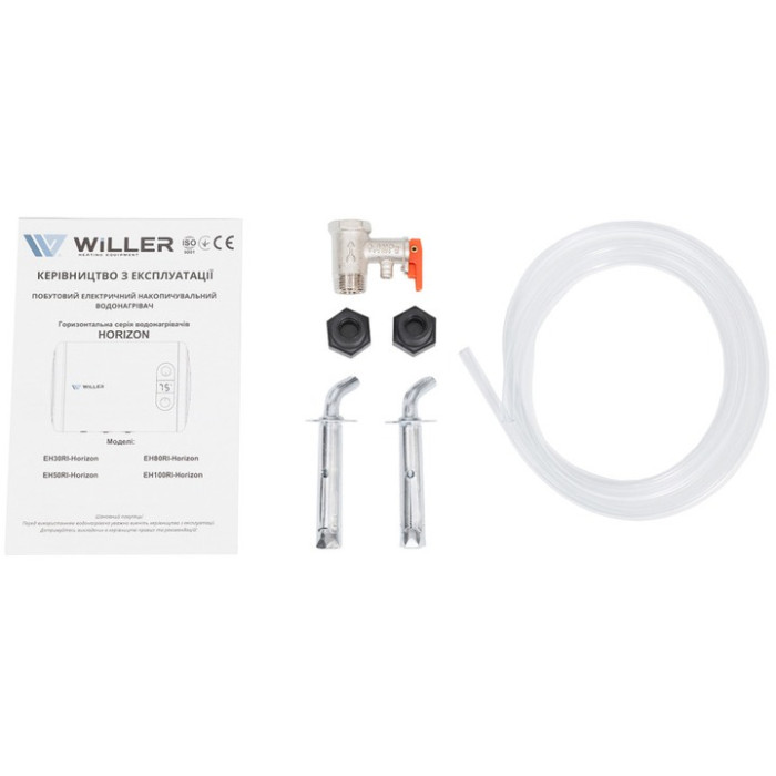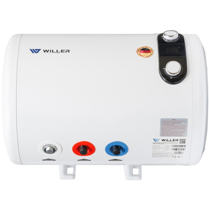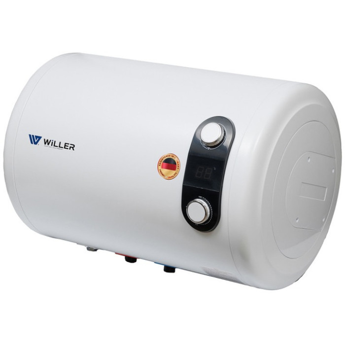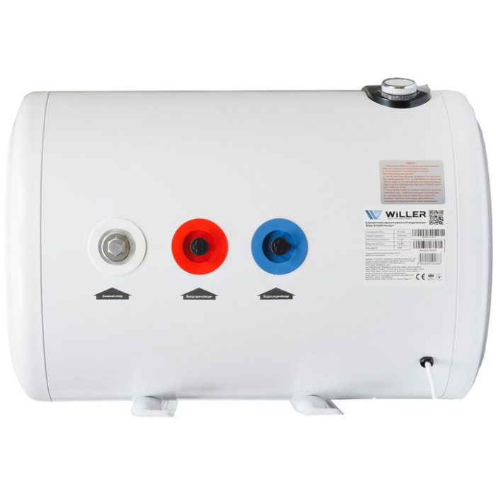 Willer EH50RI HORIZON - надійний накопичувальний електричний бойлер циліндричної форми об’ємом 50 літрів з горизонтальним розташуванням. Оснащений подвійним зануреним (мокрим) нагрівальним елементом загальною потужністю 2,0 кВт. Внутрішній бак, виготовлений зі сталі, покритої титанокварцевою емаллю, і збільшений захисний магнієвий анод забезпечують тривалий термін експлуатації. Призначений для встановлення в місцях, де недостатньо місця для вертикальних бойлерів та під стелею.