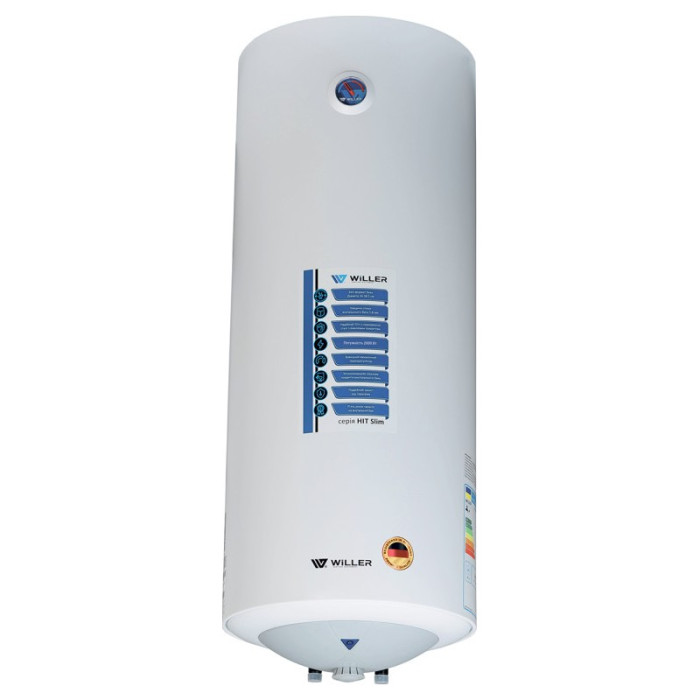 Надійний накопичувальний електричний водонагрівач WILLER EV80SR-HIT Slim циліндричної форми об’ємом 80 літрів. Оснащений мокрим нагрівальним елементом, з нержавіючої сталі потужністю 2,0 кВт. Внутрішній бак, виготовлений зі сталі, покритої титанокварцевою емаллю, і захисний магнієвий анод забезпечують тривалий термін експлуатації. Сфера застосування - нагрівання води для побутових цілей, для душу і ванни. Для використання в будинку, квартирі, на дачі.