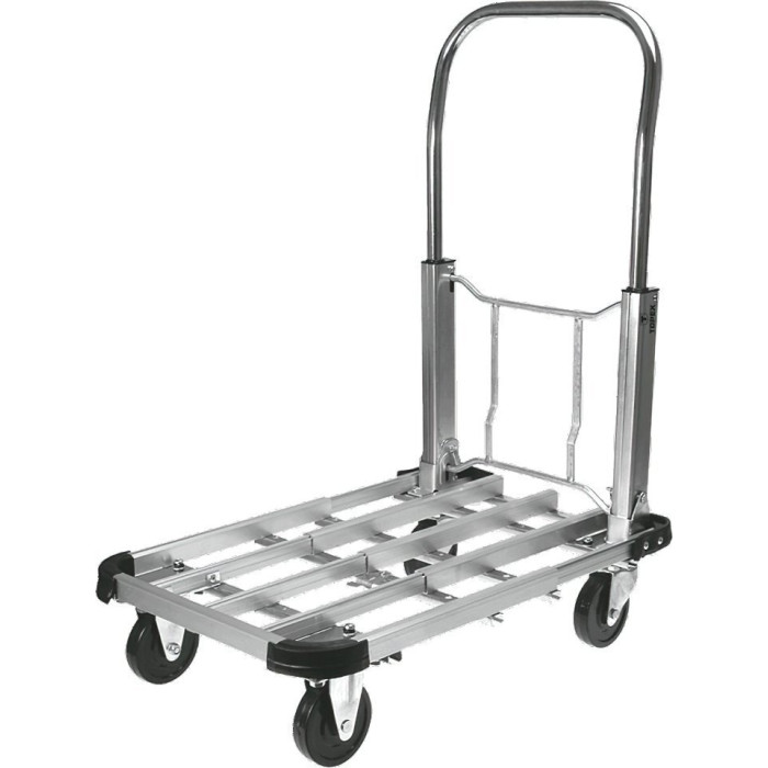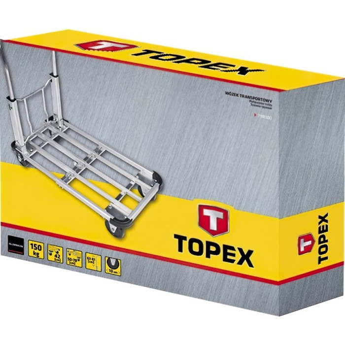 Візок вантажний складаний, платформний, TOPEX 79R300 це легкий і зручний візок з міцних алюмінієвих профілів, з регулюванням висоти ручки в діапазоні 50-70 см. Чотириколісний візок з платформою 70x42 см та вантажопідйомністю до 150 кг дозволяє ефективно перевозити важкі вантажі різних габаритів. Візок оснащений міцними колесами, а також упорними пластмасовими бортиками. Візок складний, тому зручний при транспортуванні. Вага візка 7.7 кг. У складеному стані візок займає мало місця, що зручно для зберігання та переміщення.