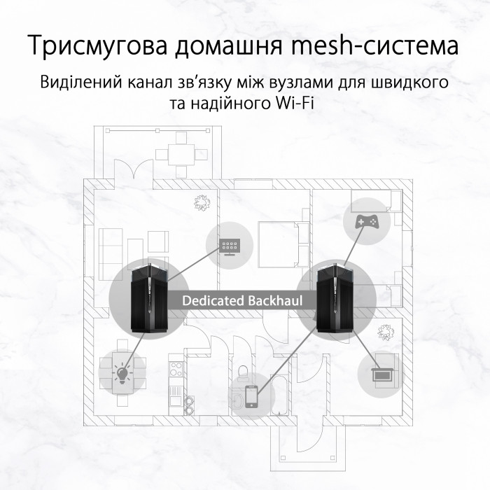 ZenWiFi Pro - это новый эталон современной mesh-системы для покрытия сетью Wi-Fi всего дома, сочетающий в себе высокую производительность и стильное исполнение. Благодаря превосходной масштабируемости эта система выводит на новый уровень сетевые возможности для продуктивной работы и цифровых развлечений. Скоростное подключение большого количества клиентов Стандарт Wi-Fi 6 наделяет ZenWiFi Pro XT12 до 4 раз более высокой пропускной способностью и до 2 раз более высокой скоростью по сравнению со стандартом Wi-Fi 5 благодаря передовым технологиям, включая BSS Color, OFDMA для обоих направлений передачи данных и режиму MU-MIMO с использованием каналов 160 МГц. Улучшилась также эффективность использования ресурсов сети, так что устройства получают всю необходимую для них полосу пропускания. ZenWiFi Pro XT12 является идеальным выбором, если к сети необходимо подключить много разнообразных сетевых устройств, таких как ПК, ноутбуки, смартфоны, NAS и умные домашние устройства. Больше потоков, большая пропускная способность ZenWiFi Pro XT12 - это 12-поточное устройство с суммарной общей скоростью передачи данных до 11000 Мбит/с. Он отлично подходит для наиболее загруженных домашних сетей, где необходимо одновременно передавать и получать данные большого количества устройств на высокой скорости и избавиться от мертвых зон. RangeBoost Plus RangeBoost Plus - это самая новая и мощная версия известной фирменной технологии ASUS RangeBoost, которая улучшает покрытие для всех устройств Wi-Fi, включая устаревшие устройства. Используя флагманский чипсет Broadcom стандарта Wi-Fi 6 нового поколения и 64-разрядный 4-ядерный процессор с тактовой частотой 2 ГГц, RangeBoost Plus опирается на многочисленные эксклюзивные технологии ASUS для значительного расширения радиуса действия сигнала и покрытия сети Wi-Fi (до 38%).