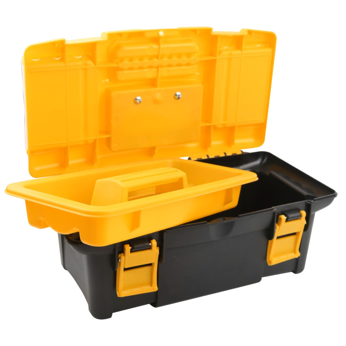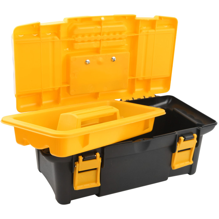Інструментальний пластиковий ящик вагою 670 г призначений для зручного зберігання і переносу інструментів з місця на місце. Підходить для майстерні, гаражу, СТО тощо. Модель виконана в фірмових кольорах бренду Tolsen Tools. Ящик розмірами 340x180x130 мм оснащений 2-ма знімними органайзерами. Лоток з ручкою і 8-ма секціями дозволяє зручно розмістити інструмент по категоріях, що полегшує їх пошук для користувача.