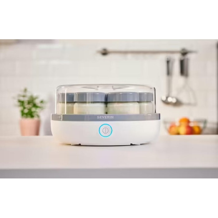 Створюйте натуральний йогурт без консервантів прямо вдома! Йогуртниця Severin оснащена 7 скляними банками по 150 мл, що можна мити в посудомийці. Підходить для грецького йогурту. Має прозору кришку, підсвічений вимикач, нековзні ніжки й відсік для змотування кабелю.