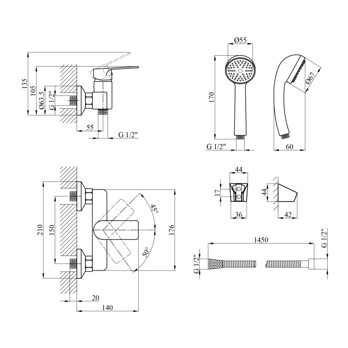 Модель укомплектована всім необхідним для комфортного приймання душу: круглою лійкою з одним режимом струменя, гнучким шлангом довжиною 1450 мм та кронштейном для фіксації ручного душу. Настінний монтаж на ексцентриках гарантує легке встановлення та стабільність конструкції. Змішувач розрахований на роботу при тиску до 3 бар і витраті води до 13 літрів на хвилину, що робить його економним та практичним у щоденному використанні.