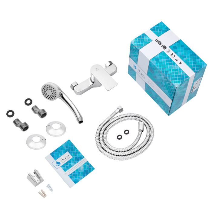 Змішувач, лійка для ручного душу, душовий шланг, кронштейн для ручного душу, кріплення, інструкція.