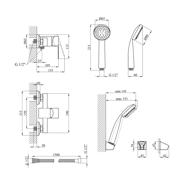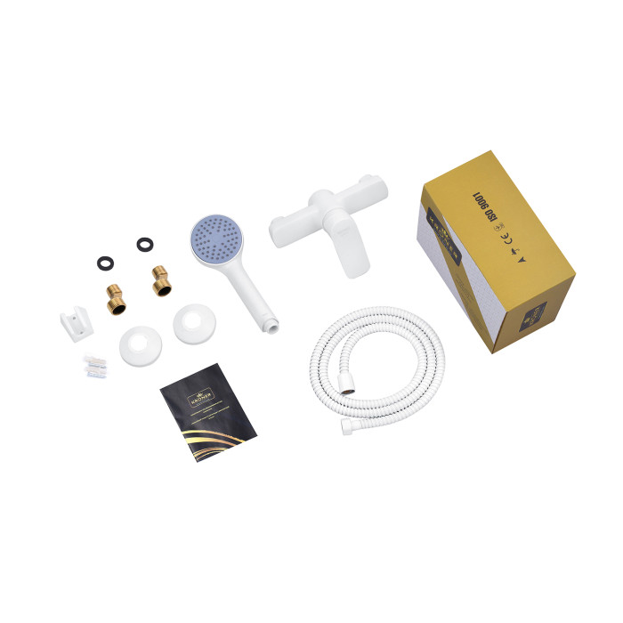 Смеситель, лейка для ручного душа, душевой шланг, кронштейн, крепежи, инструкция.