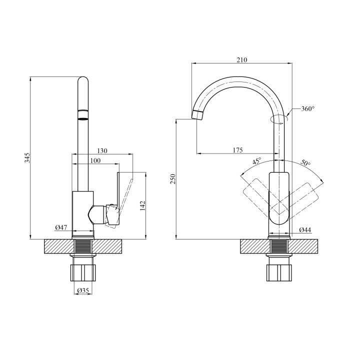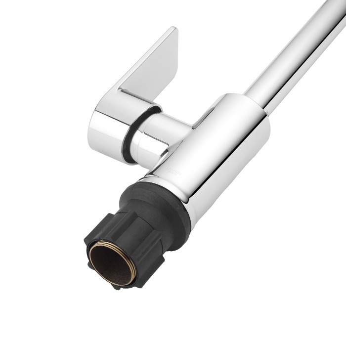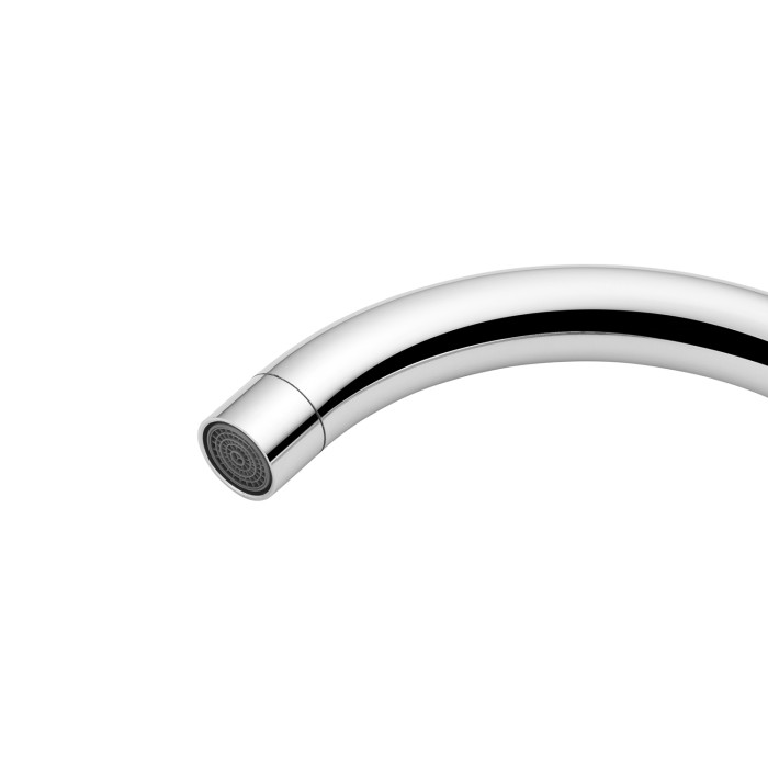 U-подібний поворотний вилив висотою 250 мм та довжиною 175 мм забезпечує зручний доступ до мийки та дозволяє легко наповнювати велику посуду або переміщувати струмінь води між чашами. Завдяки врізному способу монтажу та кріпленню на гайку встановлення відбувається швидко та надійно.