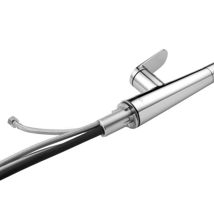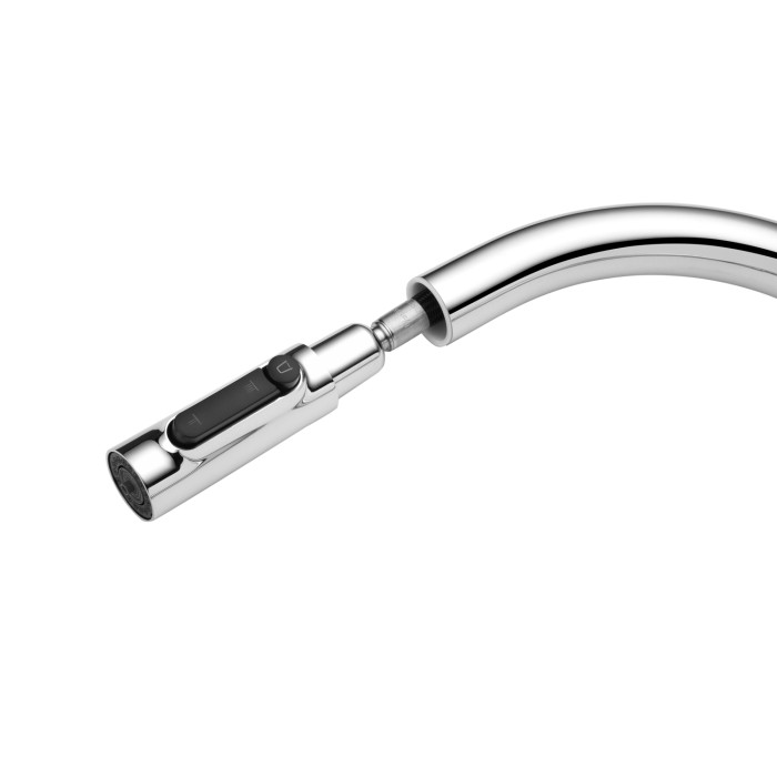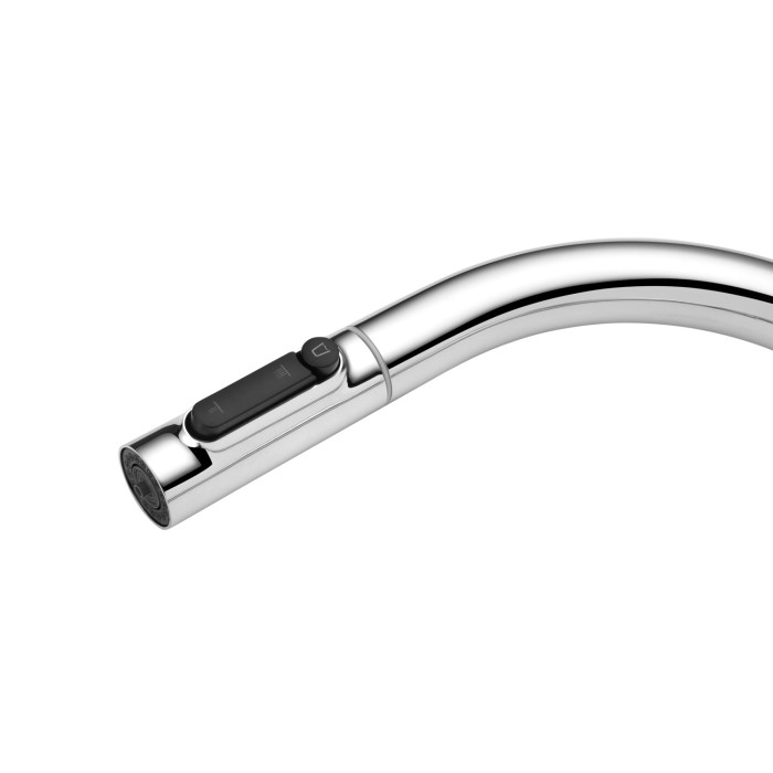Модель оснащена висувним шлангом, який робить повсякденні завдання біля мийки значно зручнішими — миття посуду, наповнення великих місткостей і очищення раковини виконуються швидко і без зайвих зусиль. Практична кнопка перемикання режимів розташована прямо на висувній лійці, забезпечуючи інтуїтивне і комфортне управління потоком води одним натисканням.