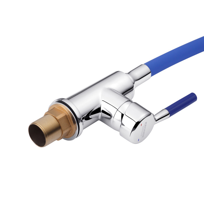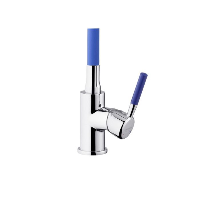 Змішувач має врізний тип монтажу з кріпленням за допомогою гайки, що забезпечує надійність фіксації. Гнучкий тип підведення дозволяє зручно під'єднати змішувач до водопроводу. Корпус виконаний у хромованому кольорі, а вилив у синьому, що надає йому елегантного вигляду. Поверхня корпусу глянсова, а вилив має матове покриття.