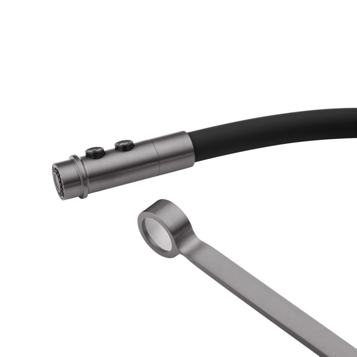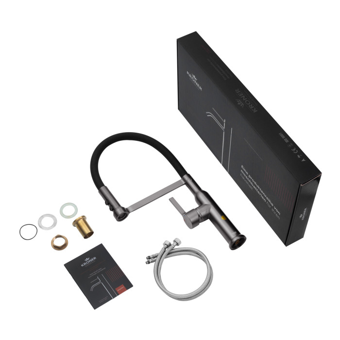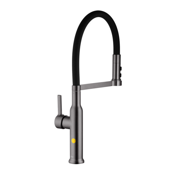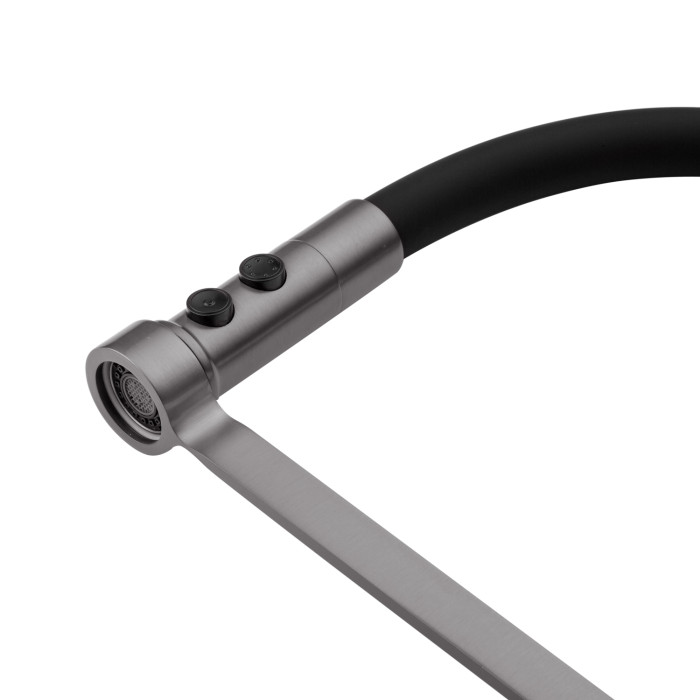 Корпус виготовлений з високоякісної латуні з матовим графітовим покриттям, яке надає змішувачу елегантний вигляд і захищає його від корозії. Гнучкий силіконовий вилив чорного кольору додає сучасного акценту і підвищує комфорт у щоденному використанні. Важливою особливістю є тримач, який фіксує вилив: він може працювати як у зафіксованому положенні, так і вільно маневрувати, що робить змішувач надзвичайно зручним в експлуатації.