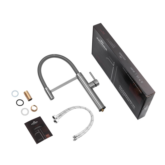 Змішувач для кухні Kroner KRP Ersel - GRP03999 поєднує в собі елегантний брашований корпус чорного кольору з функціональним чорним рефлекторним виливом, що робить його ідеальним вибором для будь-якої сучасної кухні.