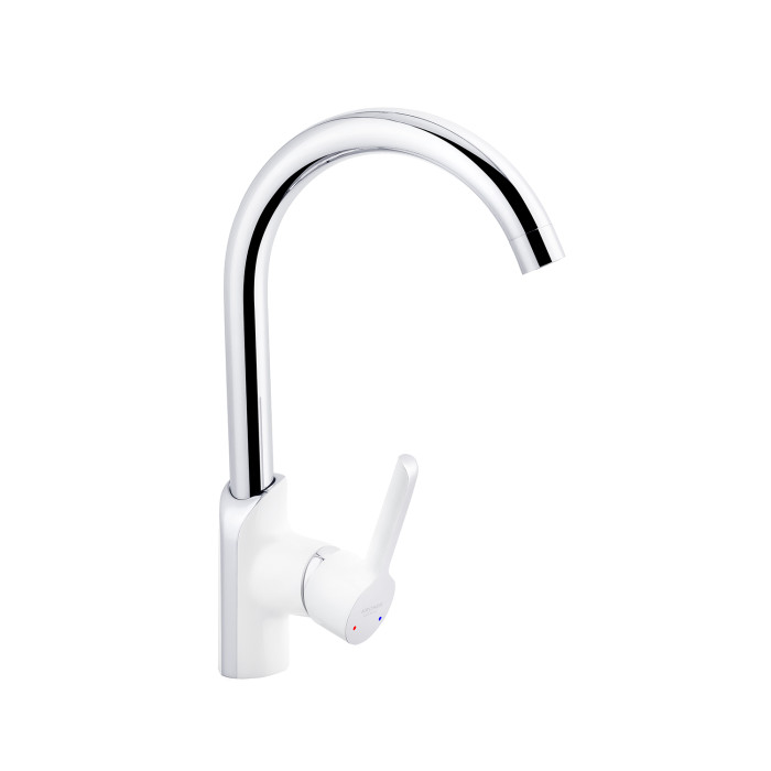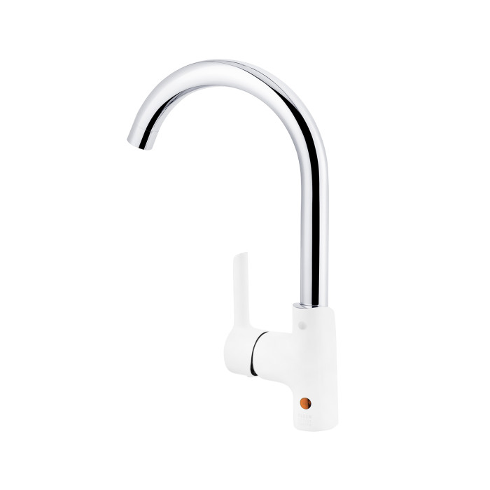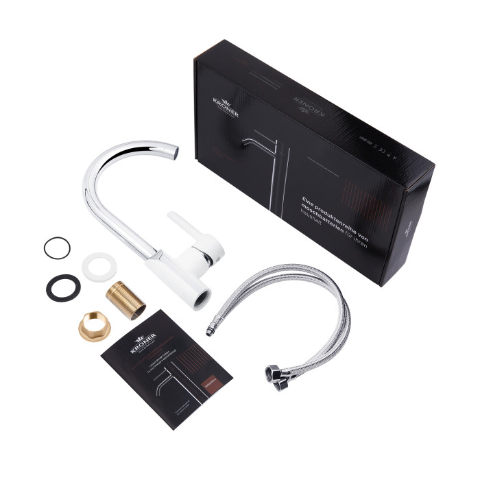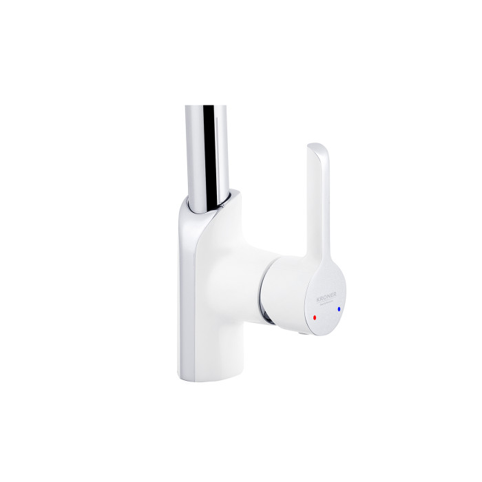 Змішувач для кухні Kroner KRP Essen - W030 - ідеальний вибір для вашої кухні. Виготовлений з високоякісної латуні, він гарантує міцність та довговічність. Має привабливу глянцево-матову поверхню хромовано-білого кольору, що додає йому елегантності. Змішувач оснащений картриджним механізмом змішування, що дозволяє зручно регулювати температуру води. Його унікальна U-подібна форма виливу забезпечує зручність під час наповнення посуду або миття продуктів. Насолоджуйтесь функціональністю і стилем змішувача Kroner.
