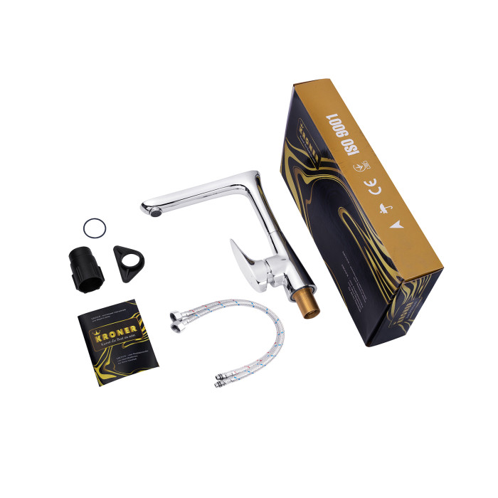 Смеситель для кухни Kroner KRP Küche - C034 – идеальный выбор для вашей кухни. Изготовлен из высококачественной латуни, гарантирует прочность и долговечность. Обладает привлекательным глянцевым хромированным цветом, что придает ему элегантность. Смеситель оснащен картриджным механизмом смешивания, позволяющим удобно регулировать температуру воды. Его уникальная Г-образная форма излива обеспечивает удобство при наполнении посуды или мытья продуктов. Наслаждайтесь функциональностью и стилем смесителя Kroner.и.