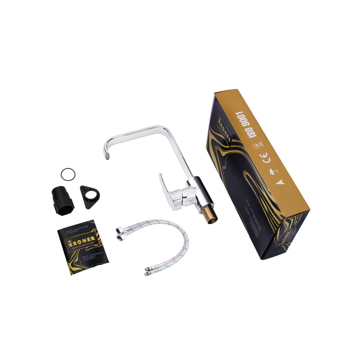 Смеситель для кухни Kroner KRP Küche - C037 – идеальный выбор для вашей кухни. Изготовлен из высококачественной латуни, гарантирует прочность и долговечность. Обладает привлекательным глянцевым хромированным цветом, что придает ему элегантность. Смеситель оснащен картриджным механизмом смешения, позволяющим удобно регулировать температуру воды. Его уникальная Г-образная форма излива обеспечивает удобство при наполнении посуды или мытья продуктов. Наслаждайтесь функциональностью и стилем смесителя Kroner.