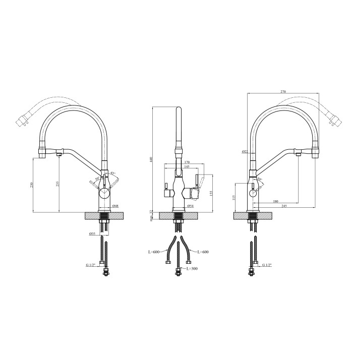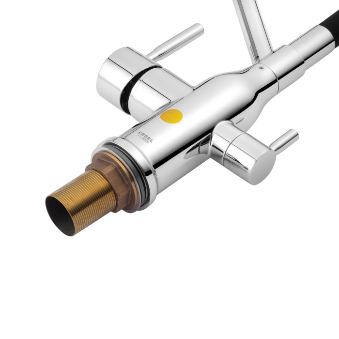 Основні характеристики: латунний корпус, одноважільне керування, гнучкий вилив, окремий канал для питної води, монтаж на один отвір.
