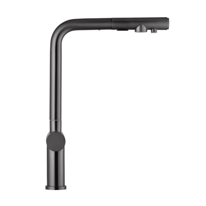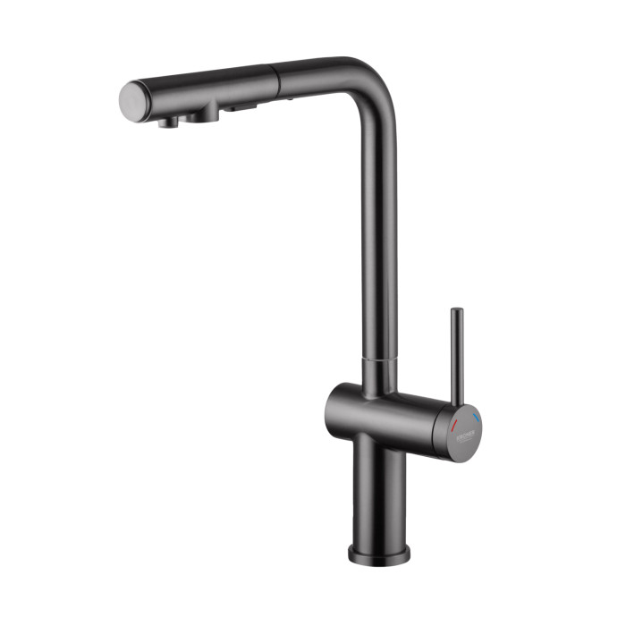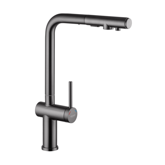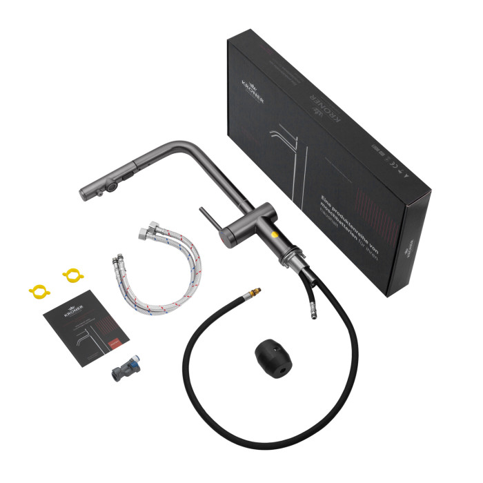 Змішувач для кухні Kroner KRP Kuche - GRP03839 (графіт) — сучасний і технологічний кухонний змішувач у стильному графітовому кольорі з матовим покриттям, який ефектно підкреслює інтер'єр і виглядає особливо актуально в кухнях у стилі лофт, модерн або мінімалізм.