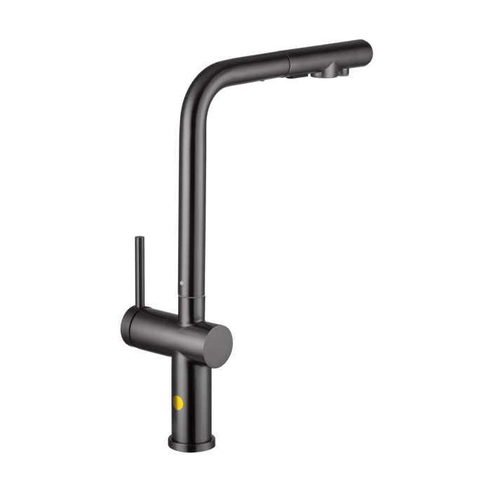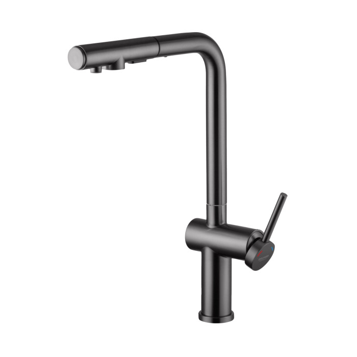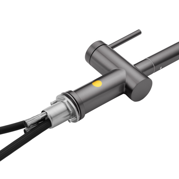 Модель оснащена висувним шлангом, що значно спрощує миття посуду, наповнення місткостей і догляд за мийкою. Особливістю змішувача є зручне управління подачею питної води — кнопка перемикання розташована прямо на самій висувній лійці, що робить використання максимально інтуїтивним і комфортним без зайвих рухів.