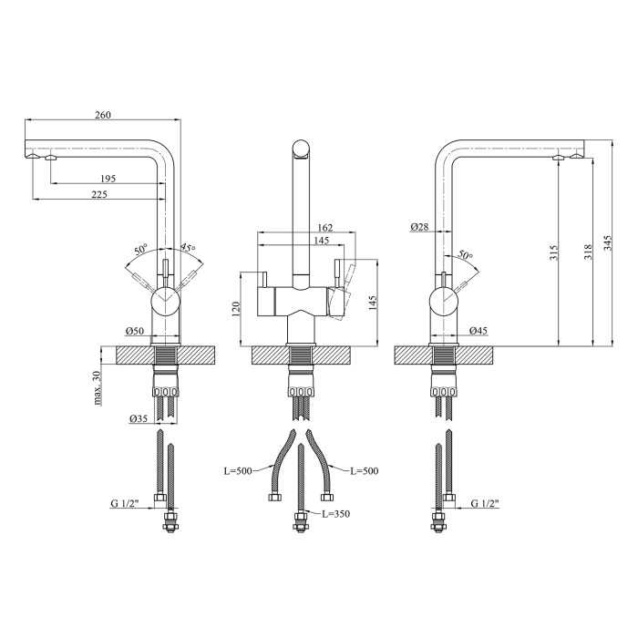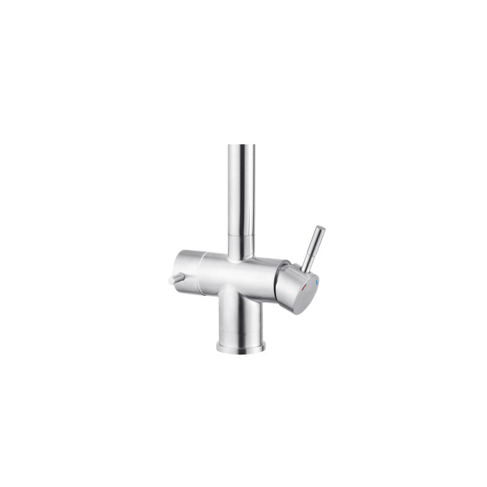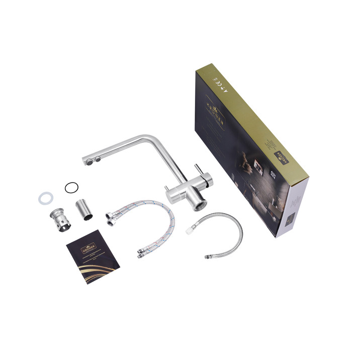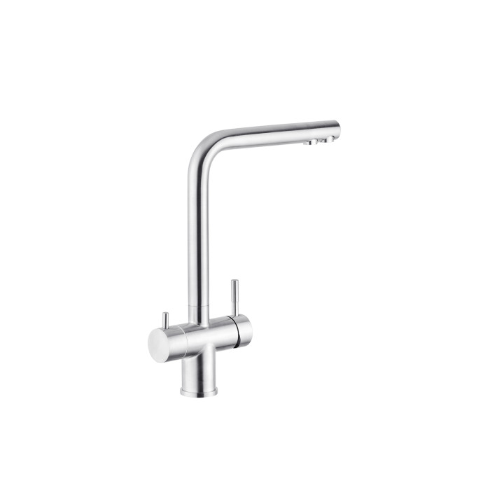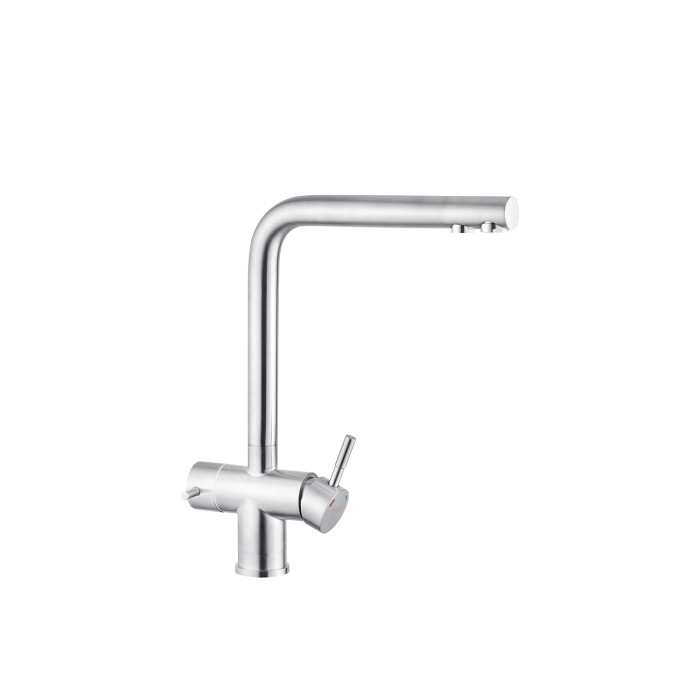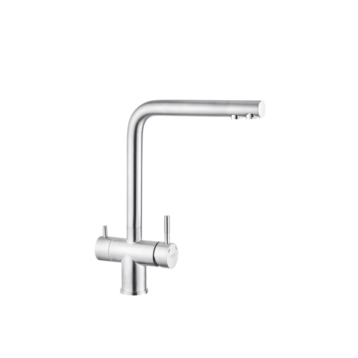 Змішувач для кухні з підключенням до фільтру Kroner KRP Edelstahl Klassisch - ESG03811 виготовлений з високоякісної нержавіючої сталі, яка не піддається корозії, стійка до ударів та появи тріщин. Змішувач має Г-подібну форму з трьома контурами підключення води. За участю першого та другого здійснюється підключення холодної та гарячої води, де змішування відбувається за допомогою картриджа.