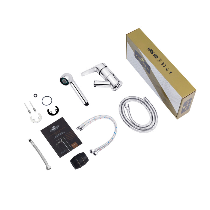 Змішувач, гнучка підводка, шланг для висувної лійки, лійка, якір, кріплення.