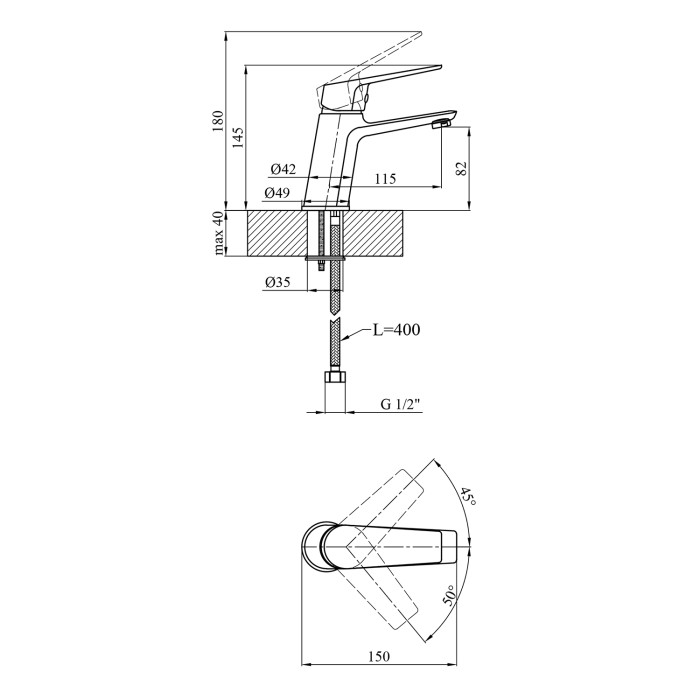 Змішувач встановлюється урізним способом за допомогою шпильки, що забезпечує надійну фіксацію. Висота виробу становить 145 мм, що робить його зручним для використання, а довжина виливу 115 мм дозволяє комфортно спрямовувати потік води. Картридж діаметром 35 мм забезпечує плавне регулювання температури та напору води.