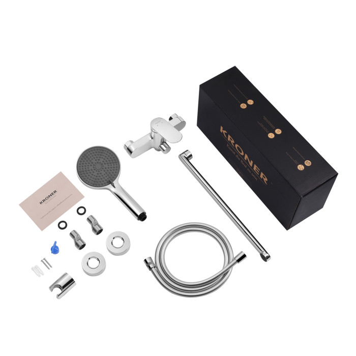 Змішувач, лійка для ручного душу, душовий шланг, кронштейн для ручного душу, кріплення, інструкція.