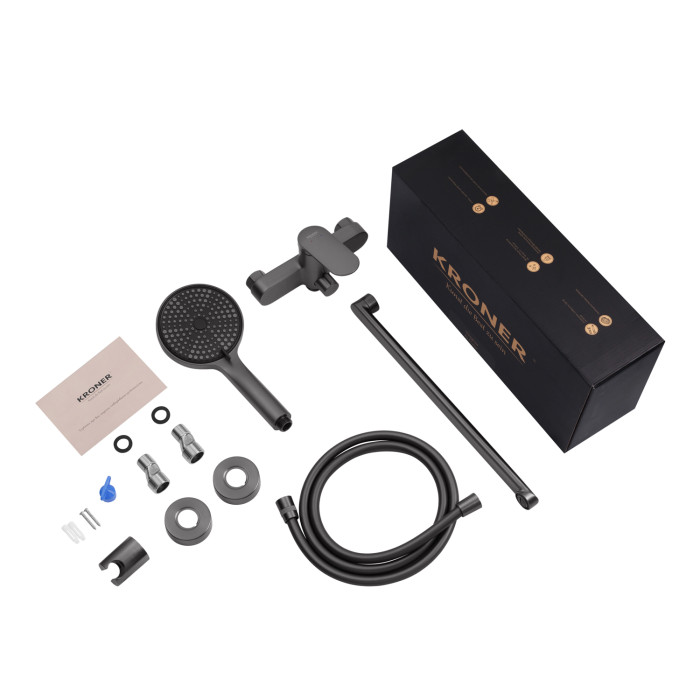 Змішувач, лійка для ручного душу, душовий шланг, кронштейн для ручного душу, кріплення, інструкція.
