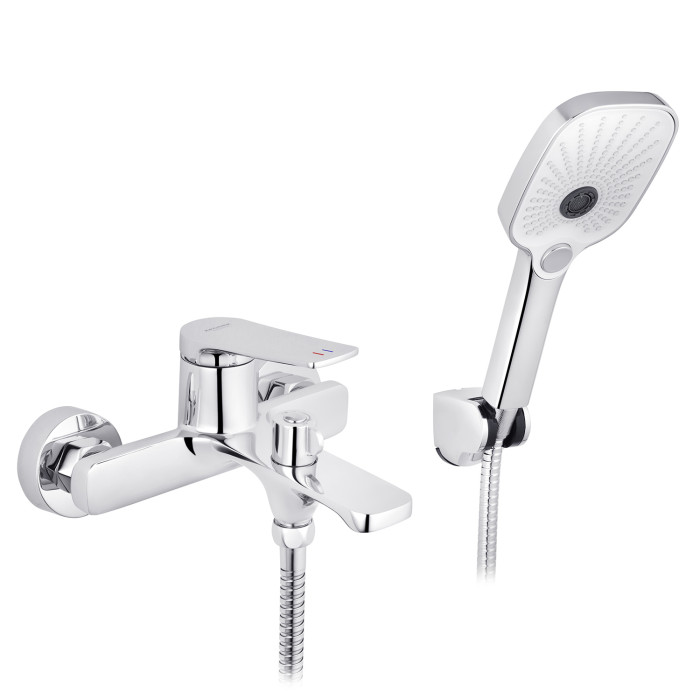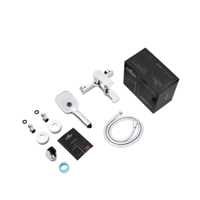 Змішувач, лійка для ручного душу, душовий шланг, кронштейн для ручного душу, кріплення, інструкція.