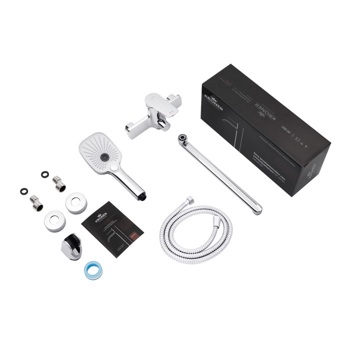 Змішувач, лійка для ручного душу, душовий шланг, кронштейн для ручного душу, кріплення, інструкція.