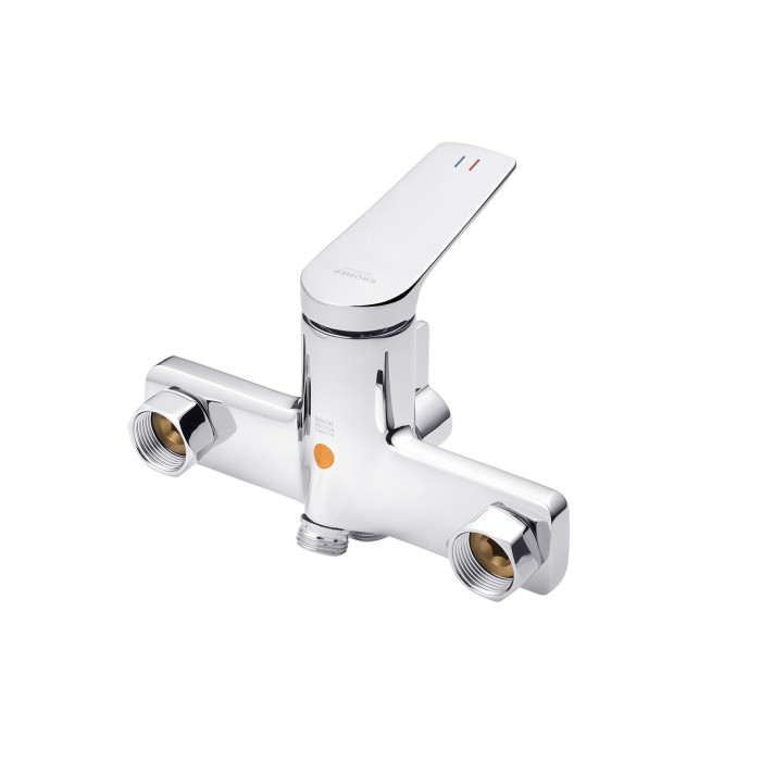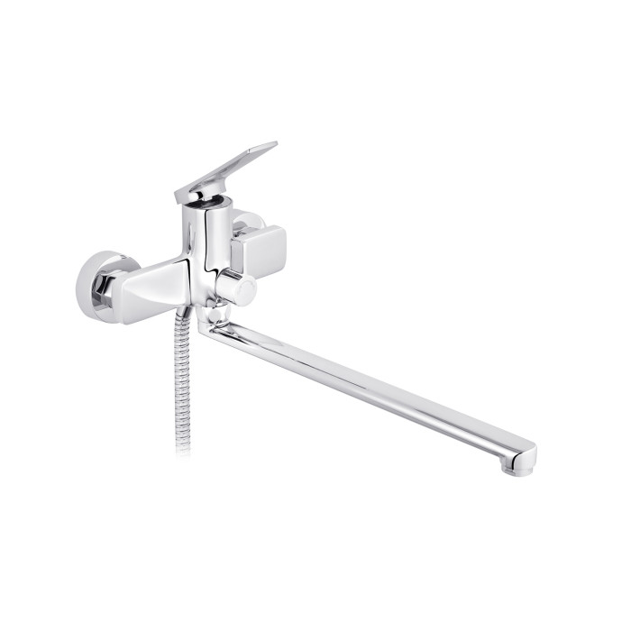 Змішувач виготовлений із міцної латуні, що гарантує довговічність і стійкість до корозії. Глянцева поверхня в хромованому кольорі надає виробу сучасного та витонченого вигляду, який ідеально доповнить будь-який інтер’єр. Настінний спосіб монтажу забезпечує надійність установки та зручність у користуванні.