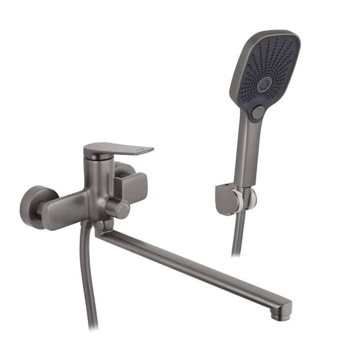 Змішувач виготовлений із міцної латуні, що гарантує довговічність і стійкість до корозії. Матова поверхня в графітовому кольорі надає виробу сучасного та витонченого вигляду, який ідеально доповнить будь-який інтер’єр. Настінний спосіб монтажу забезпечує надійність установки та зручність у користуванні.