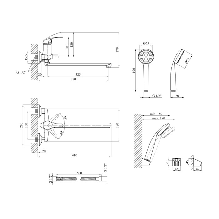 Змішувач, лійка для ручного душу, душовий шланг, кронштейн для ручного душу, кріплення, інструкція.