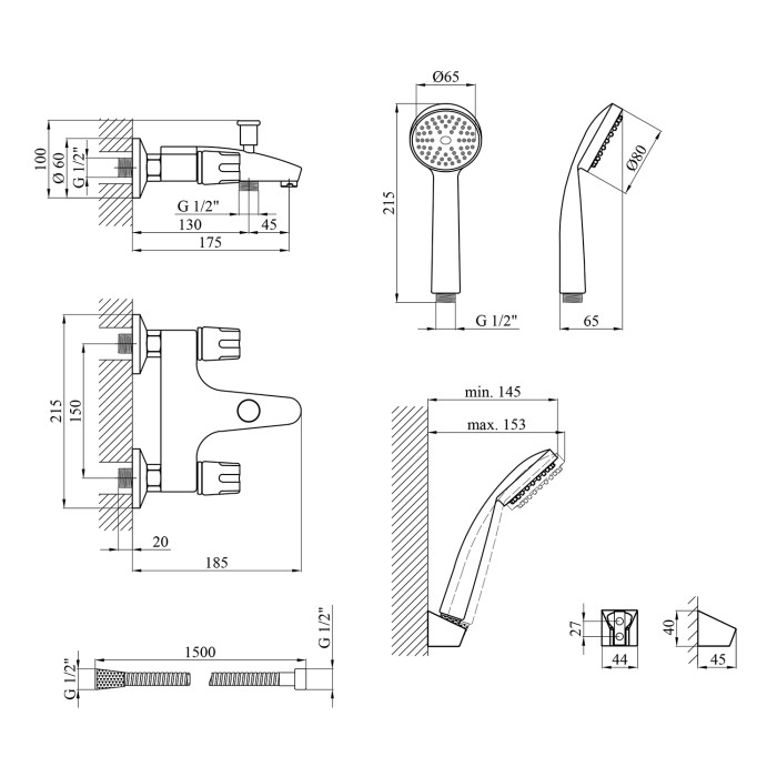 Смеситель, лейка для ручного душа, душевой шланг, кронштейн для ручного душа, крепежи, инструкция.