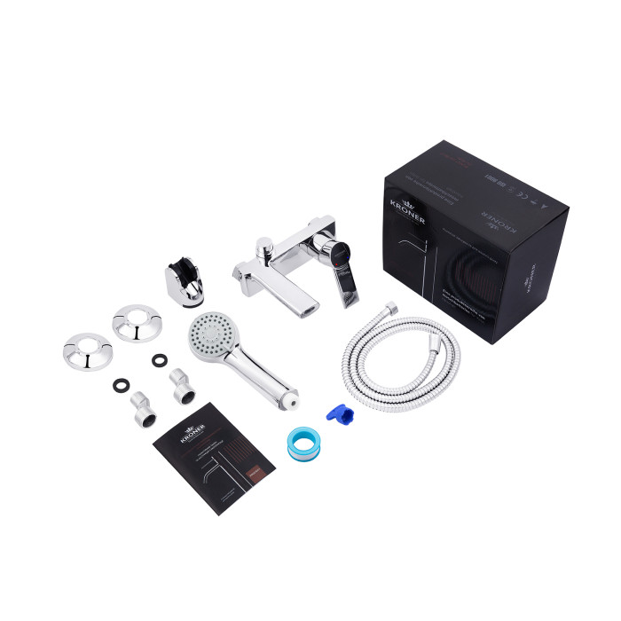 Смеситель, лейка для ручного душа, душевой шланг, кронштейн для ручного душа, крепежи, фум лента, инструкция.