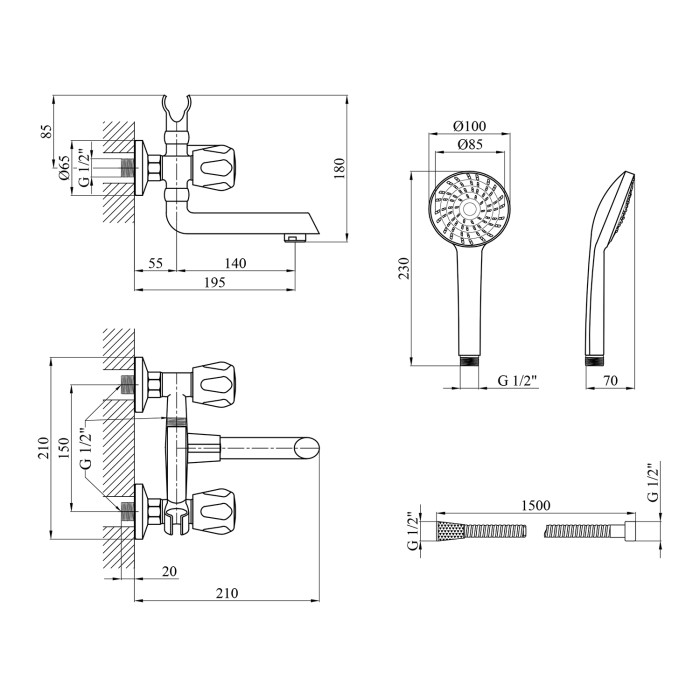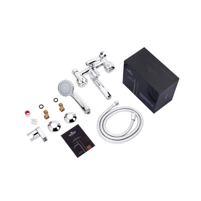 Змішувач, лійка для ручного душу, душовий шланг, тримач для ручного душу, перехідник на душовий шланг, кріплення, інструкція.