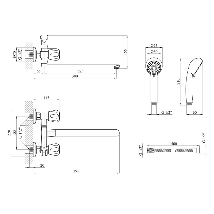 Змішувач, лійка для ручного душу, душовий шланг, кронштейн для ручного душу, кріплення, інструкція.