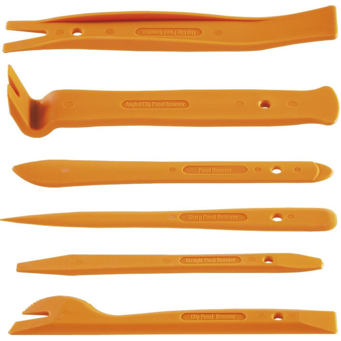 Набір знімачів панелей облицювання NEO виготовлений з високоякісного твердого нейлону. Дозволяє виконувати демонтаж елементів облицювання автомобіля без ризику пошкодження м'яких елементів і облицювальних скоб. До складу набору входять 6 знімачів. Стане в нагоді в кожної автомайстерні і майстерні по ремонту автомагнітол. Бренд NEO виправдовує очікування професіоналів.