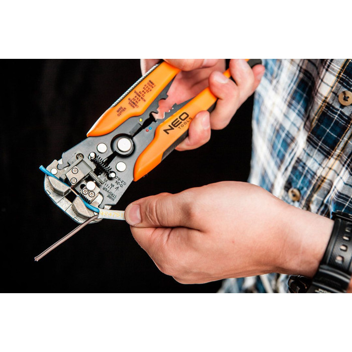 Знімач ізоляції автоматичний NEO чоловий, розміром 205 мм. Призначений для знімання ізоляції та затискання колекторних наконечників 22-10 AWG. Робочий діапазон від 0.5 до 6 мм2, для затискання наконечників від 1,5 до 6 мм2. Губки виготовлені з надзвичайно міцної сталі твердістю 52-57 HRC, що забезпечує довготривалу надійність інструмента. Ергономічне двокомпонентне руків’я додає комфорту під час праці. Якість інструменту підтверджена сертифікатом TÜV і 25-річною гарантією виробника. Марка NEO відповідає очікуванням професіоналів.