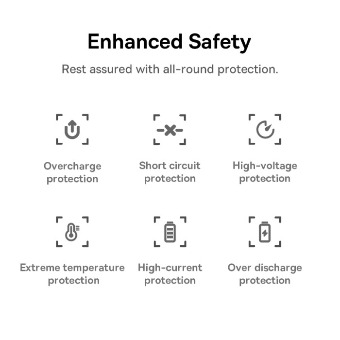 9 рівнів інтелектуального захисту (від перевантаження по силі струму, перезаряду, перегріву, перевантаження, різних перенапруг, коротких замикань) максимально збільшують експлуатаційний термін девайсу та дозволяють уникнути багатьох серйозних проблем під час підзарядки. Інтелектуальна система керування зарядом визначає оптимальні параметри підзарядки для кожного пристрою, забезпечуючи максимально безпечний та ефективний процес.