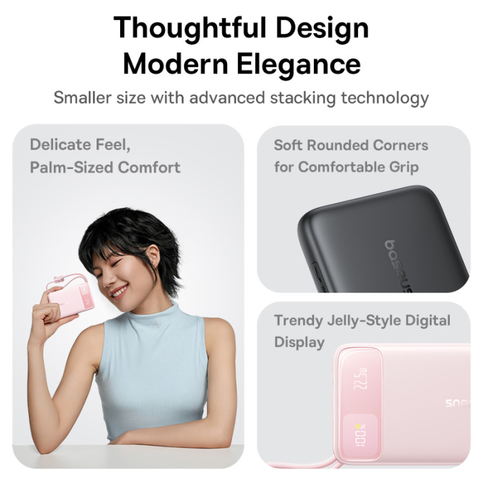 Завдяки тому, що повербанк Baseus EnerFill FC11 має компактні габарити та невелику вагу для такої ємності, його легко взяти з собою, щоб будь-якої миті мати можливість підзарядити свої мобільні пристрої. Якісний пластик, який використовувався для виготовлення корпусу, стійкий до мікродрапин та відмінно витримує перенесення в сумці. Великий екран на передній панелі завжди точно підкаже поточний рівень заряду.