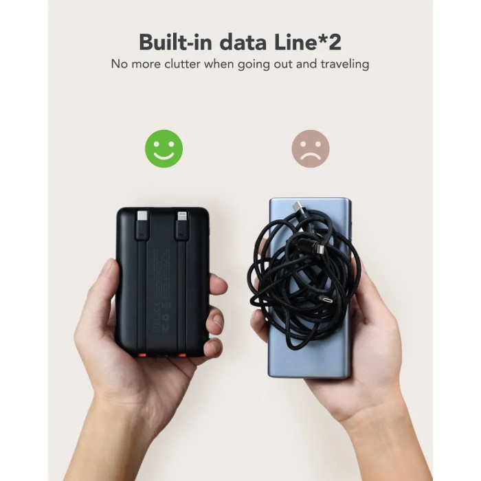 Внешний аккумулятор Veger C11 емкостью 10 000 мАч гарантирует быструю зарядку устройств в любое время и в любом месте.ПОРТАТИВНОЕ ЗАРЯДНОЕ УСТРОЙСТВО СО ВСТРОЕННЫМИ КАБЕЛЯмиЭтот внешний аккумулятор емкостью 10 000 мАч имеет выходной порт USB-A мощностью 22,5 Вт и два входных порта (18 Вт USB-C, 18 Вт Lightning), а также два встроенных кабеля (Lightning мощностью 20 Вт и USB-C мощностью 20 Вт) и подходит для непосредственного использования с большинством новейших устройств на рынке. Интеллектуальная система предотвращает перезарядку, перенапряжение, перегрузку по току и короткому замыканию.ЗАРЯЖАЙТЕ НЕСКОЛЬКО УСТРОЙСТВ ОДНОВРЕМЕННОПорты поддерживают быструю зарядку трех устройств одновременно, таких как смартфон, планшет, портативная консоль или наушники TWS, что экономит ваше время и избавляет от необходимости ждать пополнения заряда батареи.БЕРИТЕ ЕГО С СОБОЙ КУДА УГОДНОМинималистичный, тонкий дизайн и легкий вес делают внешний аккумулятор удобным для путешествий, а светодиодный дисплей сообщит вам об уровне заряда вашего устройства.