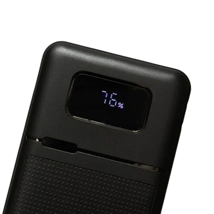 Корпус повербанка виготовлений із вогнестійкого пластику з матовим покриттям, що підвищує довговічність пристрою та запобігає ковзанню в руках. На передній панелі розташований LED-дисплей, який відображає рівень заряду у відсотках і дозволяє легко контролювати залишок енергії.
