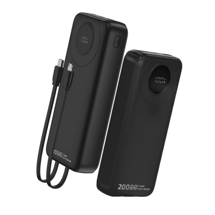 — кабель Lightning.Такий помічник стане незамінним для тих, хто користується одразу двома пристроями, які мають різні роз’єми для заряджання.Power bank WUW Y202 оснащений світлодіодним цифровим дисплеєм. У режимі реального часу на ньому відображається рівень заряду батареї. Пристрій виготовлений з міцного й вогнестійкого пластику. Має літій-полімерний акумулятор. Оснащений двома роз’ємами — USB та USB-C.