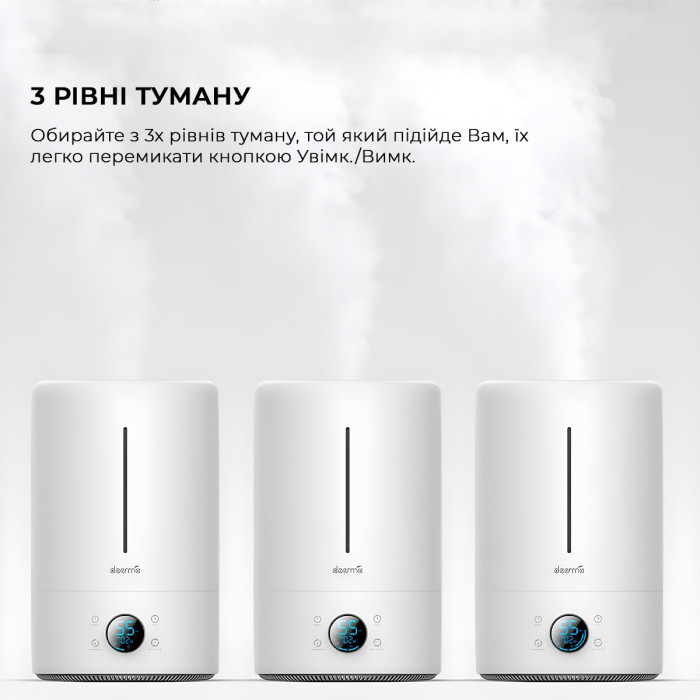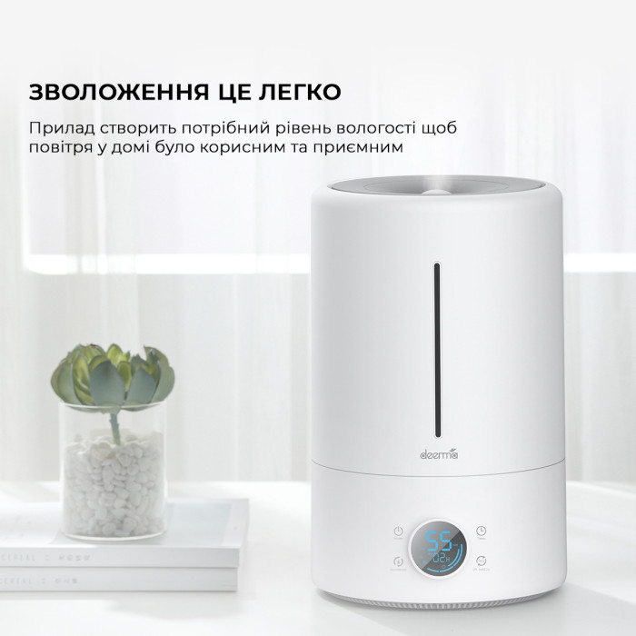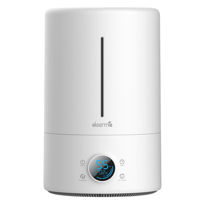 Зволожувач Deerma DEM-F682 з продуктивністю 300 мл/год і місткістю 5 л забезпечує рівномірний розподіл водяної димки і підходить для кімнати площею 25-30 м2. Крім того, він обладнаний УФ-лампою, яка стерилізує воду перед її розпиленням в повітря.
