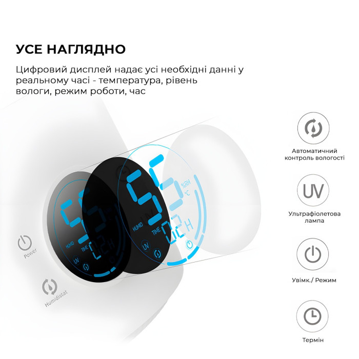 DEM-F628S UV здатний відстежувати вологість і температуру навколишнього середовища. Розумні алгоритми пристрою, забезпечує підтримку оптимального діапазону рівня вологості та припиняє процес зволоження, коли цей оптимальний показник досягнутий.