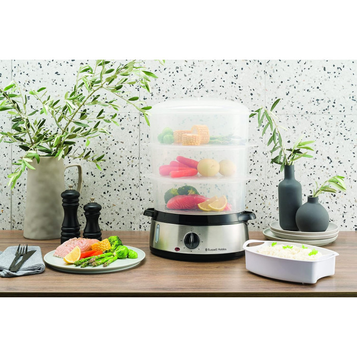 Пароварка Russell Hobbs Cook&Home 800Вт, чаша-3/3/3л, резервуар для води -1л, механічне керування, 3 яруси, метал/пластик, чорний